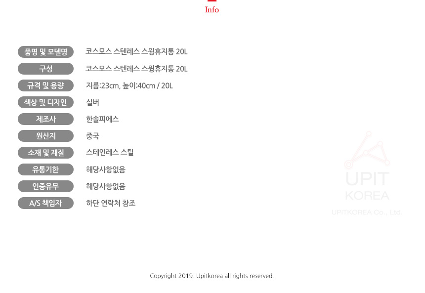 코스모스 스텐레스 스윙휴지통 20L 6564 이미지/