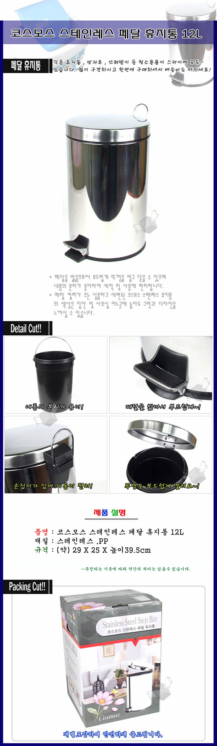 코스모스 스테인레스 페달 휴지통12L