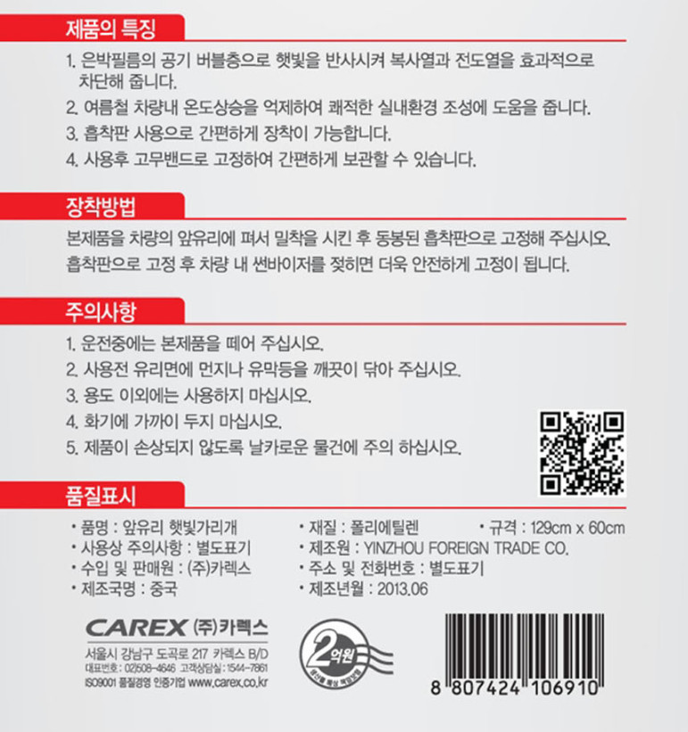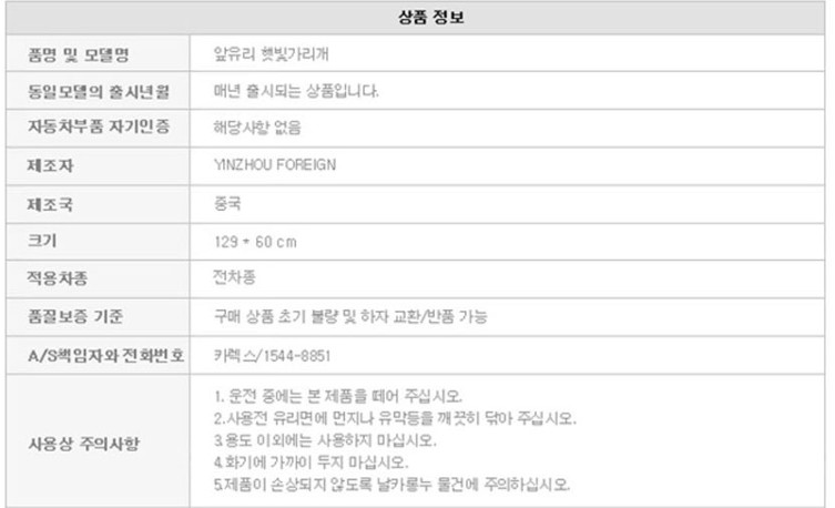 1. 품명 및 모델명 : [카렉스] 앞유리 햇빛가리개/자외선차단 눈부심보호