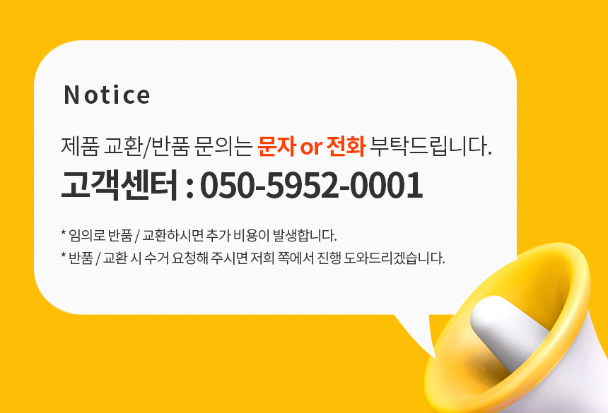 • 초기제품 이상의 경우 동일한 제품으로 1:1 교환원칙, 사용후 제품이상은 A/S를 원칙으로 합니다.