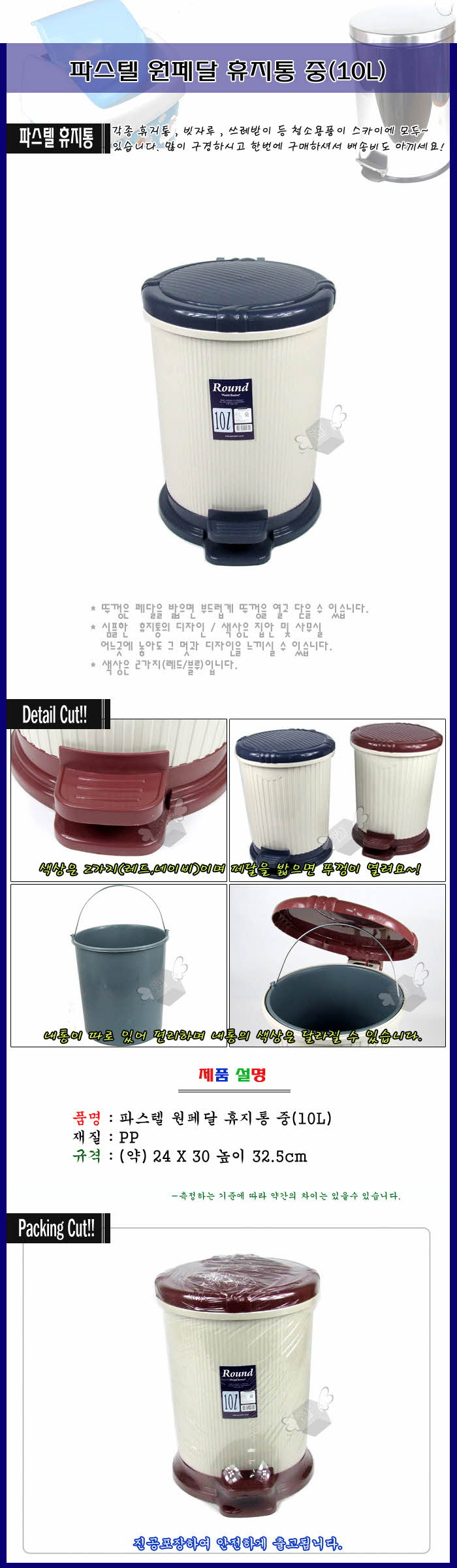 파스텔 원페달 중 휴지통10L(2색상)