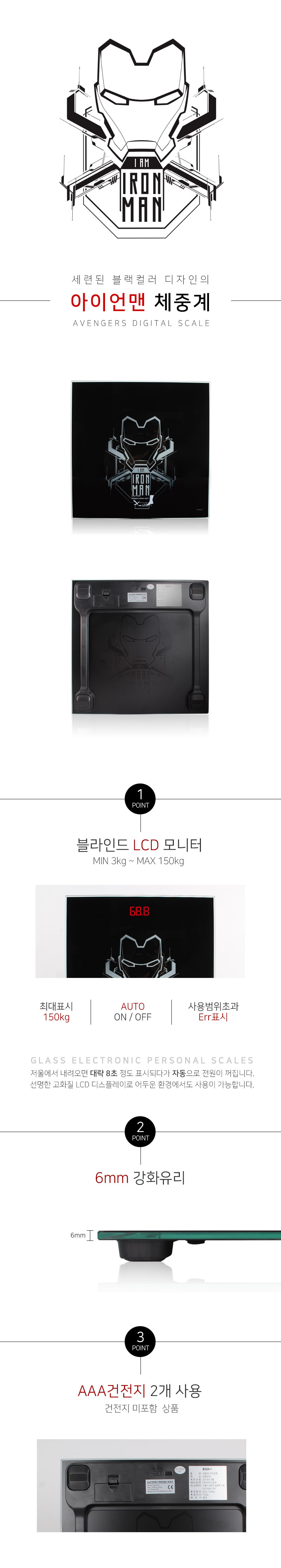 마블 아이언맨 체중계 강화유리 블라인드 LCD모니터 최대150kg