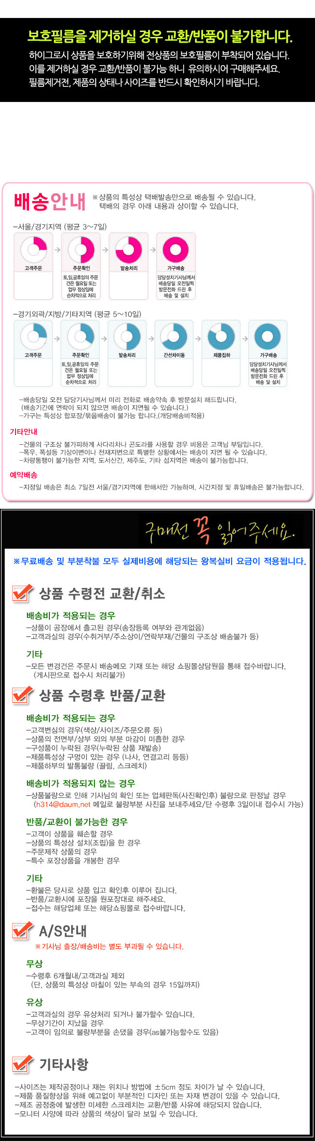 • 초기제품 이상의 경우 동일한 제품으로 1:1 교환원칙, 사용후 제품이상은 A/S를 원칙으로 합니다.