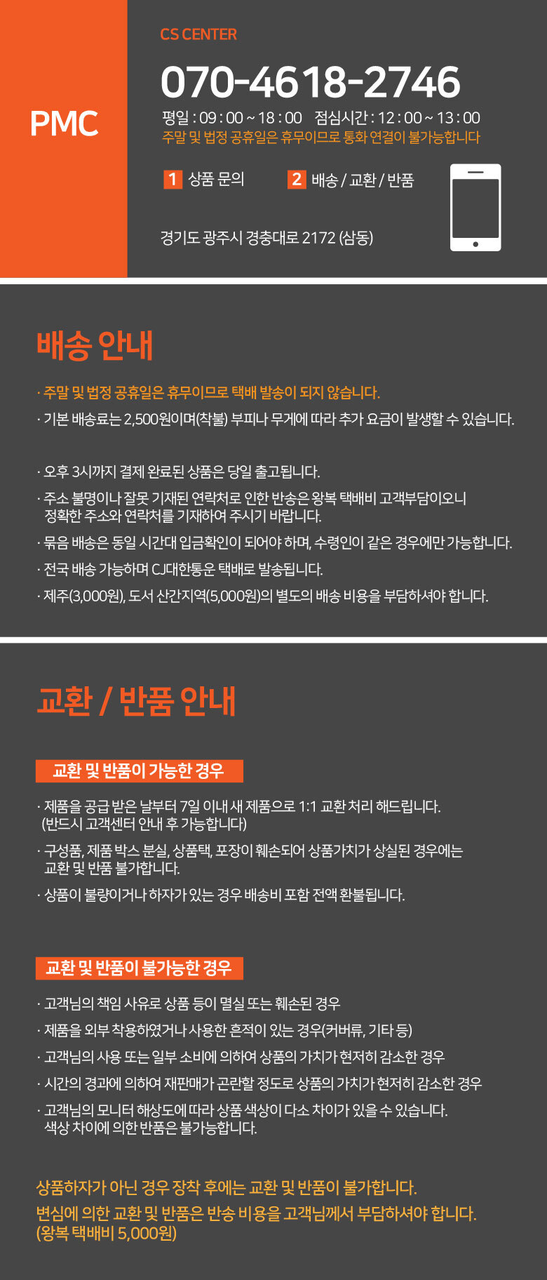 • 초기제품 이상의 경우 동일한 제품으로 1:1 교환원칙, 사용후 제품이상은 A/S를 원칙으로 합니다.