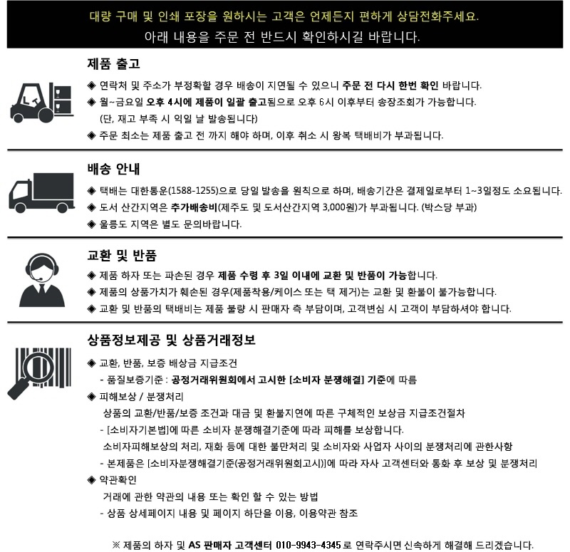 • 반품/환불조건: 도착후 1주일 이내 사용하지 않은 상태에서 가능합니다,초기제품 이상의 경우 동일한 제품으로 1:1 교환원칙, 사용후 제품이상은 A/S를 원칙으로 합니다,