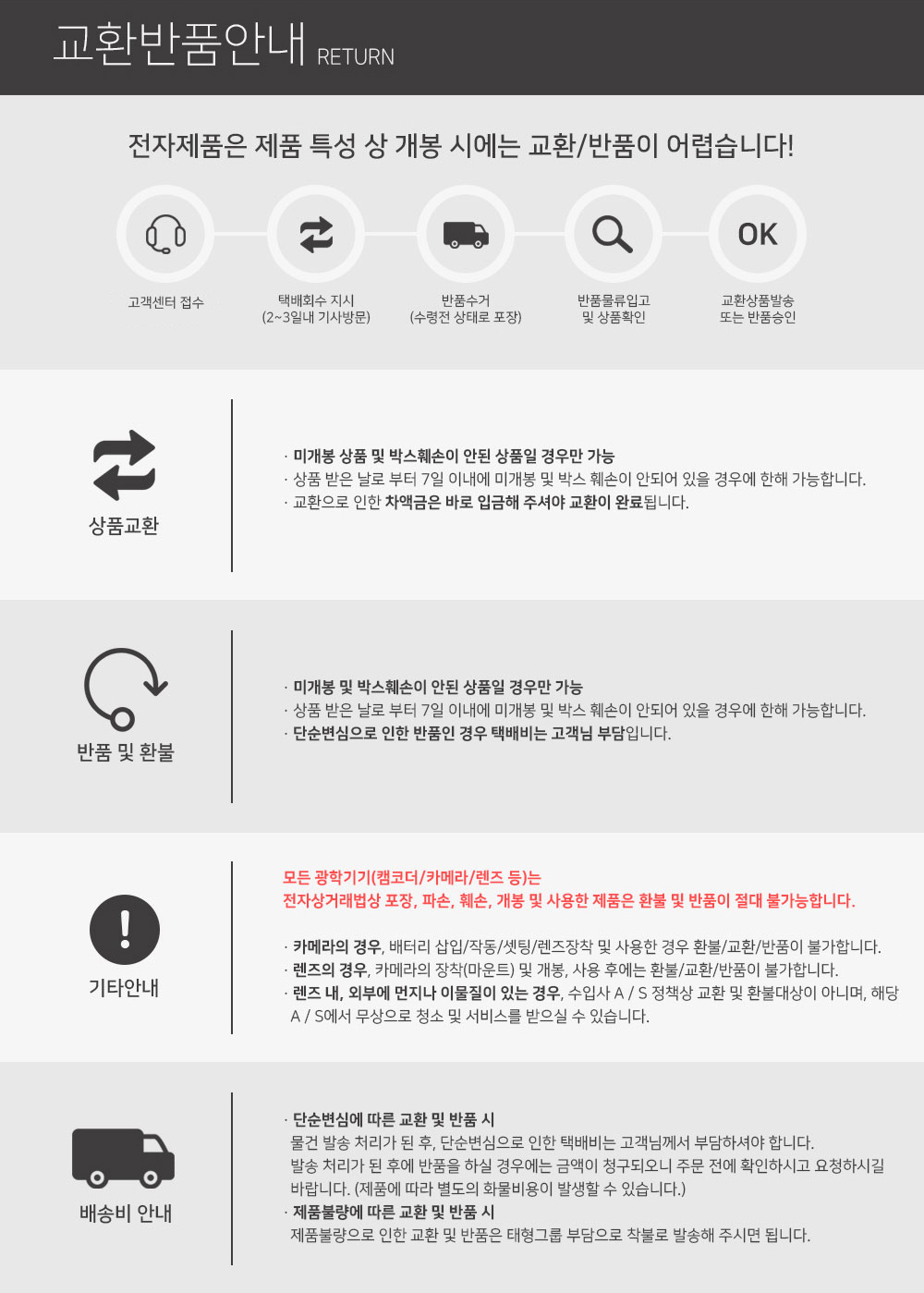 • 초기제품 이상의 경우 동일한 제품으로 1:1 교환원칙, 사용후 제품이상은 A/S를 원칙으로 합니다.