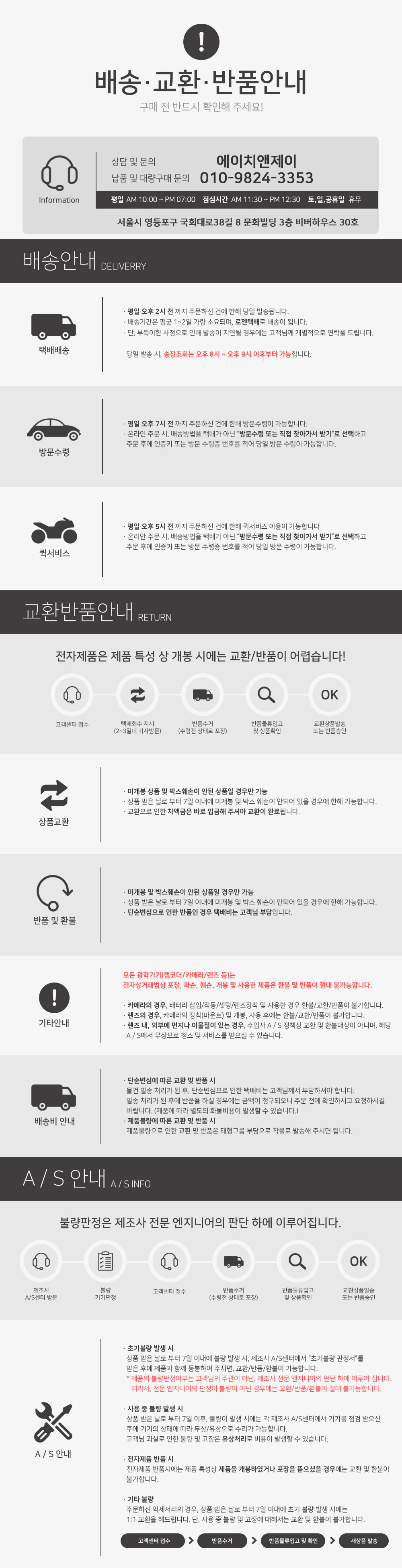 • 초기제품 이상의 경우 동일한 제품으로 1:1 교환원칙, 사용후 제품이상은 A/S를 원칙으로 합니다.