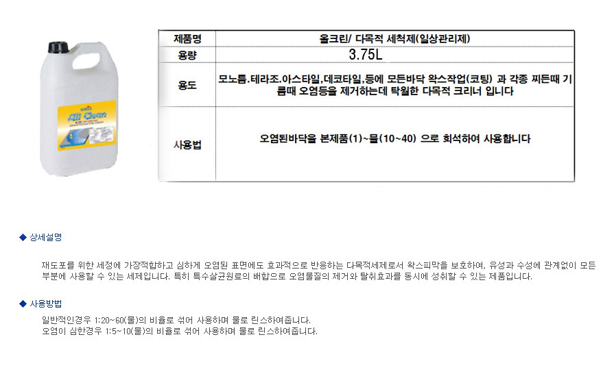 킴앤에쓰 올크린 3.75L 다목적세정제 찌든때제거제 일상관리제 이미지/