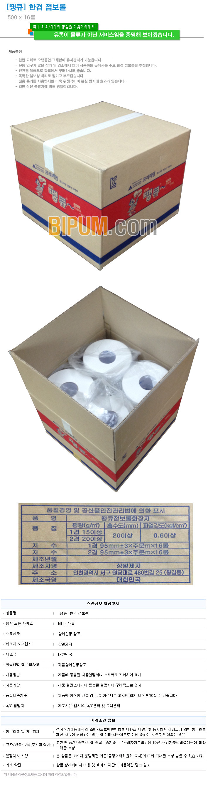 1. 품명 및 모델명 : 땡큐500 점보롤화장지 x 16롤