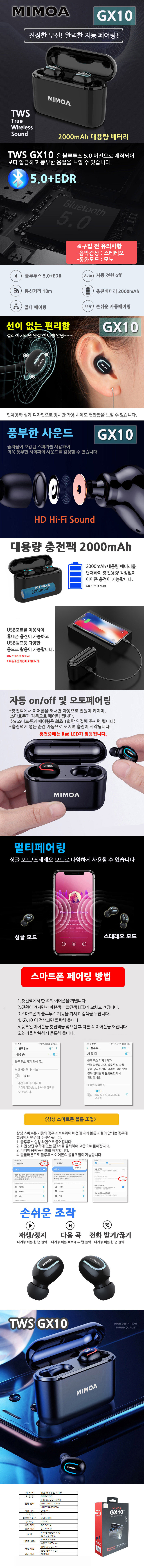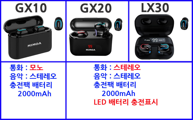 MIMOA 블루투스 스테레오 이어폰 대용량충전팩2000mAh GX10 GX20 LX30 께