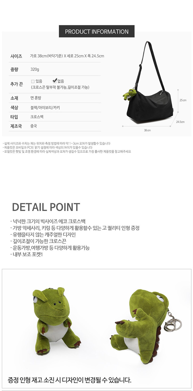 A141 빅사이즈 에코 크로스백 운동가방 여행가방등 다양한 활용 고퀄리티인형 제공