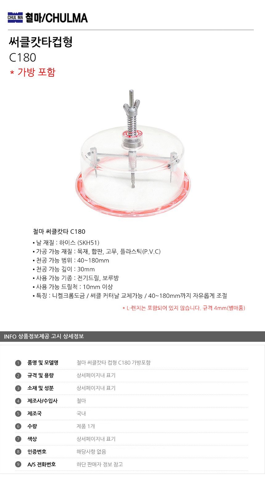 철마 써클캇타 컵형 C180 가방포함 공구액세서리 보링비트 목공비트 드릴비트 전동드릴