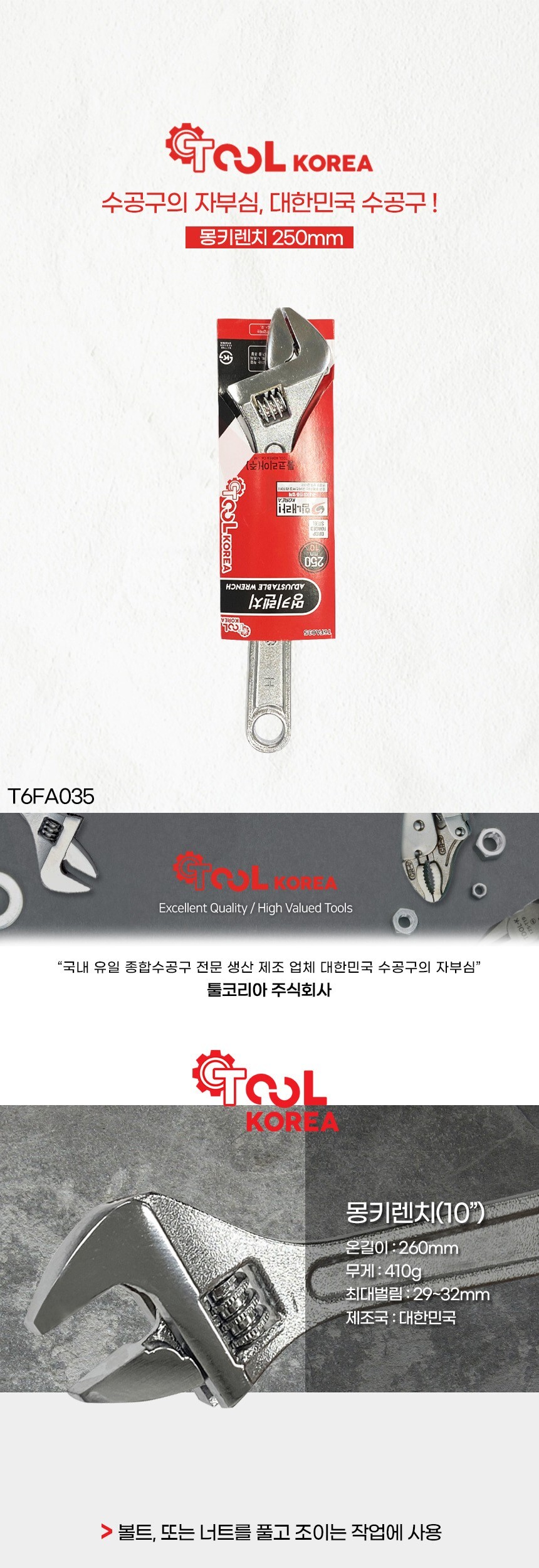 툴코리아 T6FA035 몽키 렌치 250mm 공구 수공구 수작업공구 수작업 작업공구