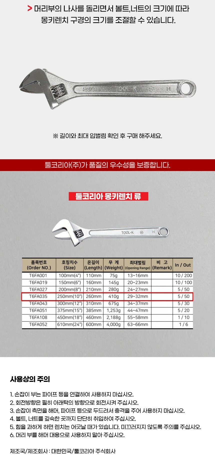 툴코리아 T6FA035 몽키 렌치 250mm 공구 수공구 수작업공구 수작업 작업공구 이미지/