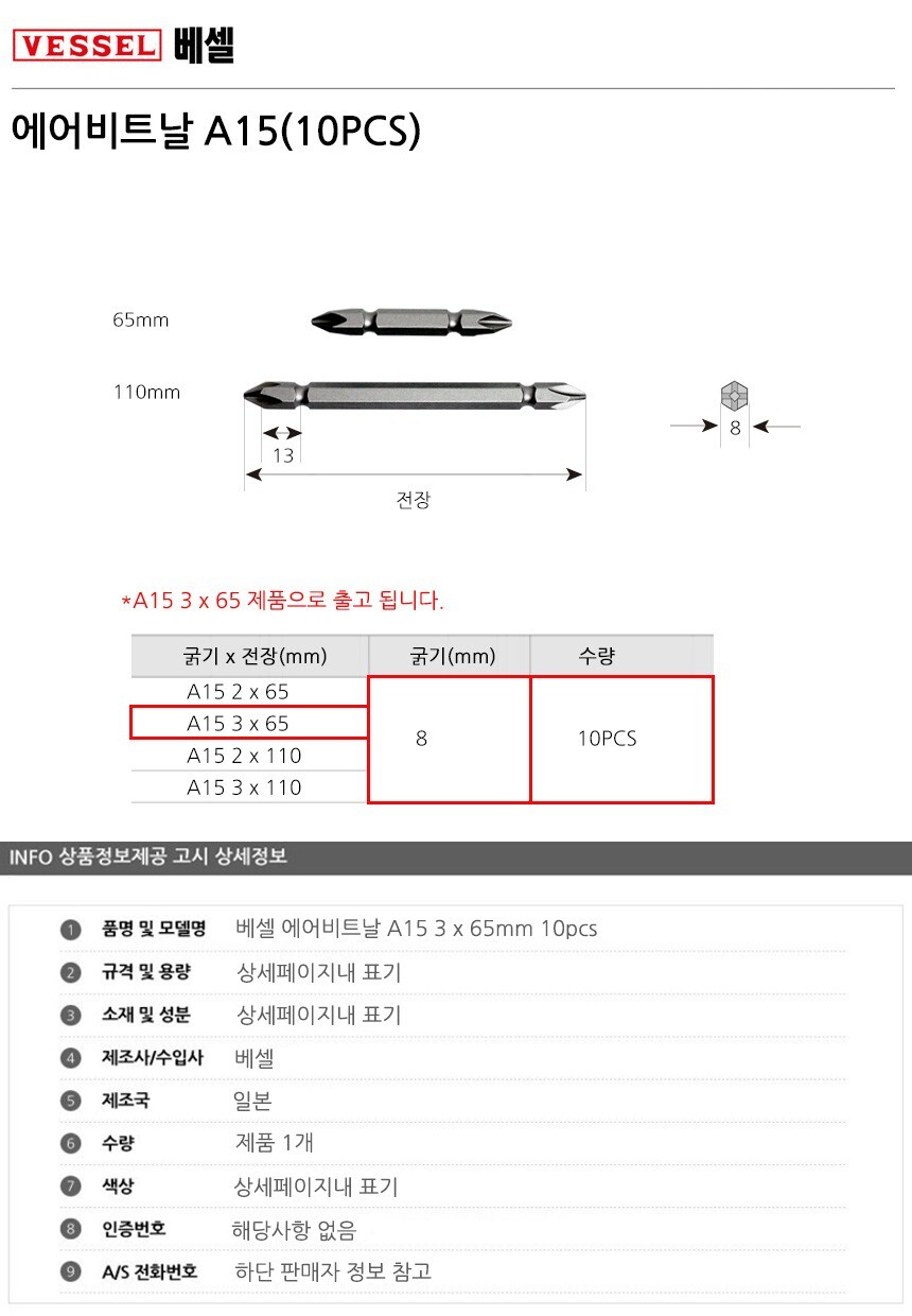 베셀 에어비트날 A15 3 x 65mm 10pcs 공구 수공구 수작업공구 수작업 작업공구