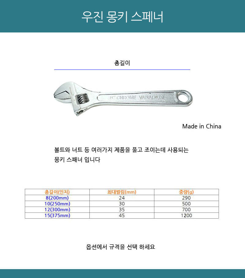 카이만 몽키 스패너 15인티 작업공구 작업공구 렌치 자동차공구 목공구 DIY 공구 목공구 철물