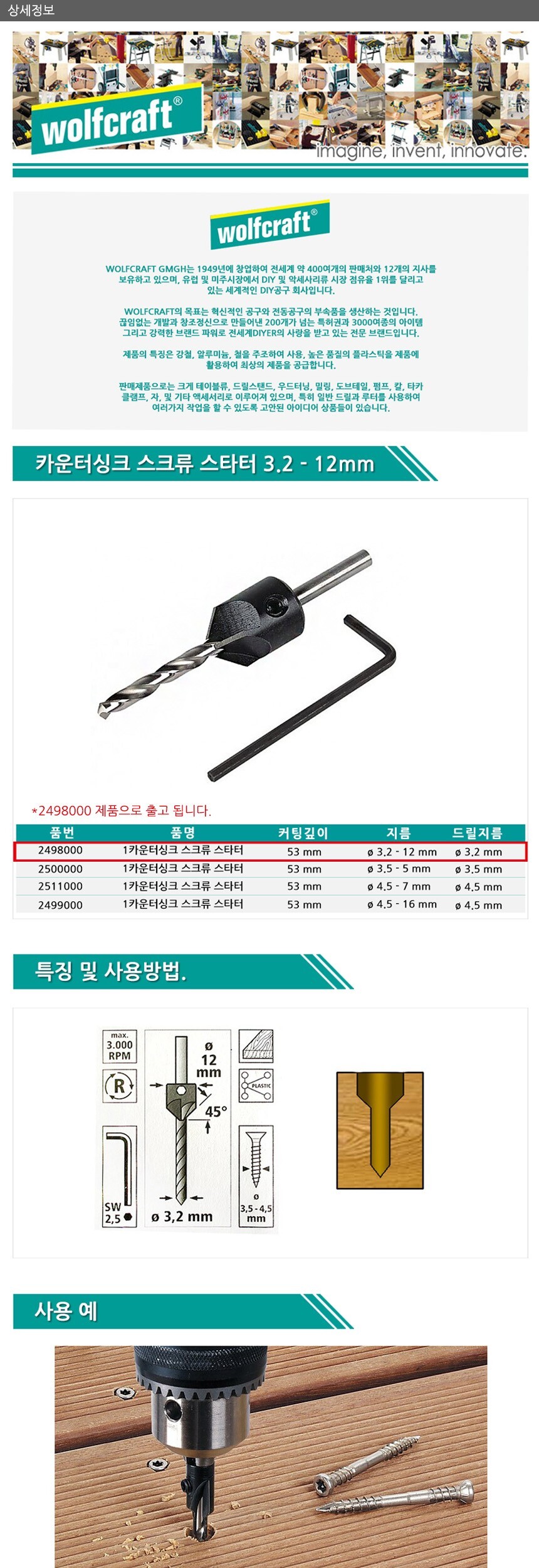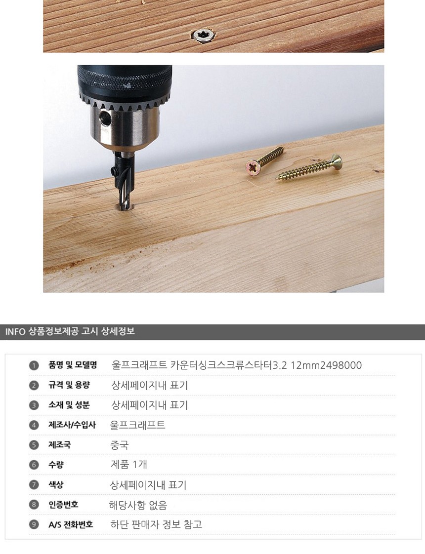울프크래프트 카운터싱크스크류스타터3.2 12mm2498000 공구 수공구 수작업공구 수작업