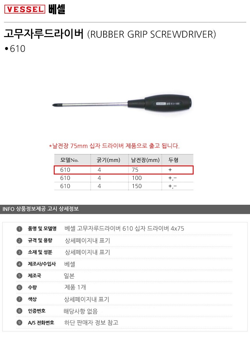 베셀 고무자루드라이버 610 십자 드라이버 4x75 공구 수공구 수작업공구 수작업 작업공구 이미지/