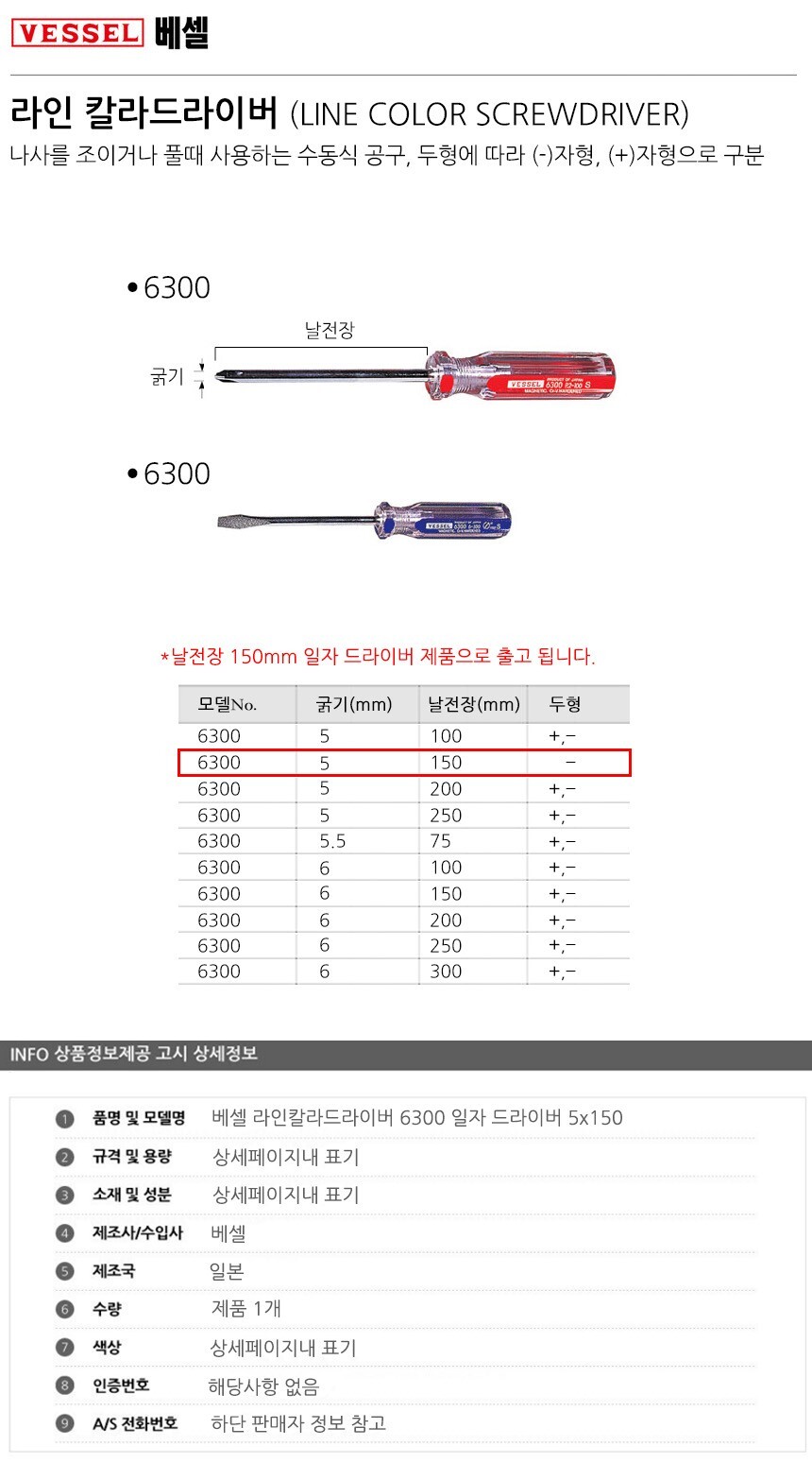 베셀 라인칼라드라이버 6300 일자 드라이버 5x150 공구 수공구 수작업공구 수작업 작업