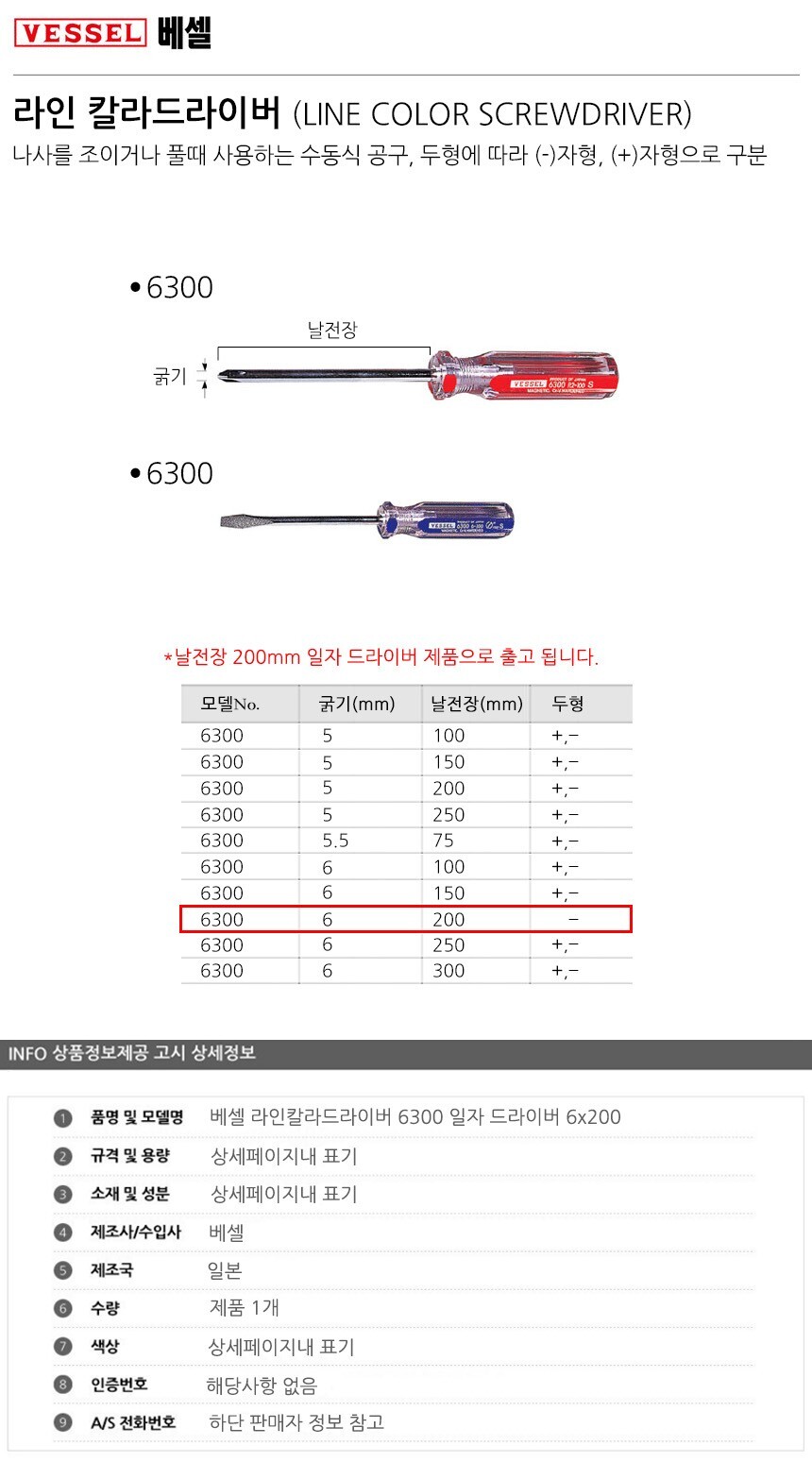 베셀 라인칼라드라이버 6300 일자 드라이버 6x200 공구 수공구 수작업공구 수작업 작업 이미지/