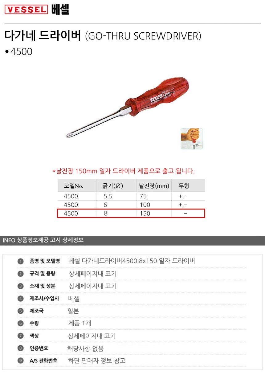베셀 다가네드라이버4500 8x150 일자 드라이버 공구 수공구 수작업공구 수작업 작업공구