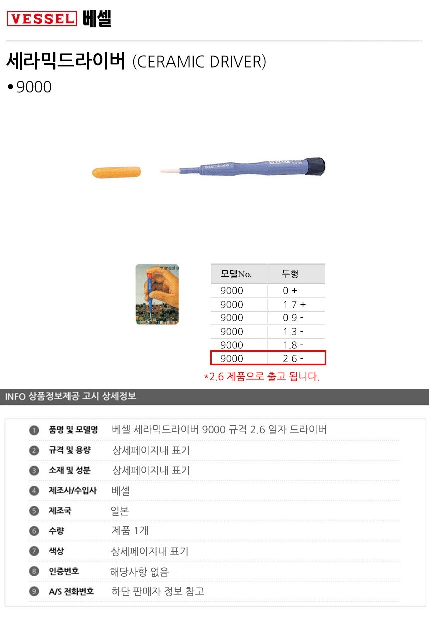 베셀 세라믹드라이버 9000 규격 2.6 일자 드라이버 공구 수공구 수작업공구 수작업 작업