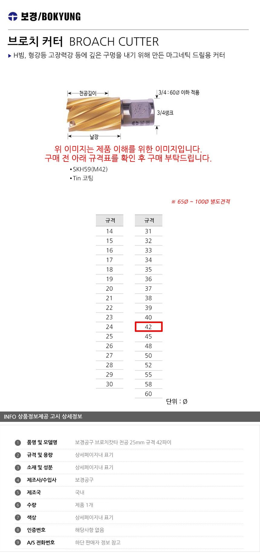 보경공구 브로치캇타 천공 25mm 규격 42파이 공구액세서리 보링비트 마그드릴 브로치캇타  이미지/