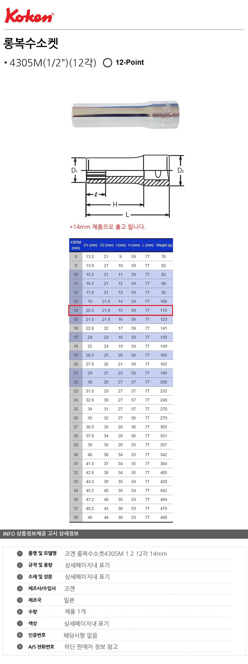 코겐 롱복스소켓4305M 12각 14mm 이미지/