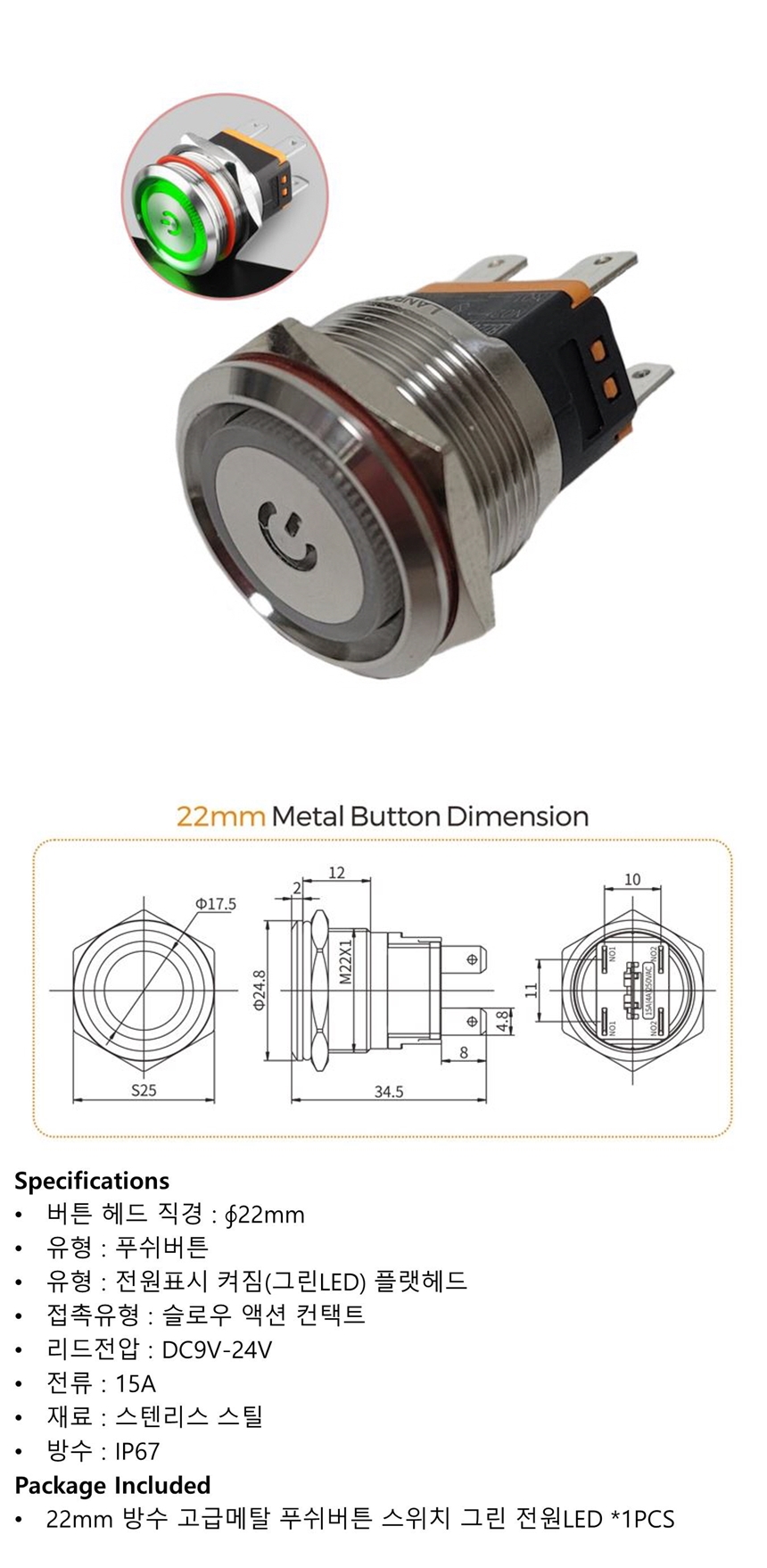 12V 22mm 방수 푸쉬 버튼 스위치 그린LED 전원표시 이미지/