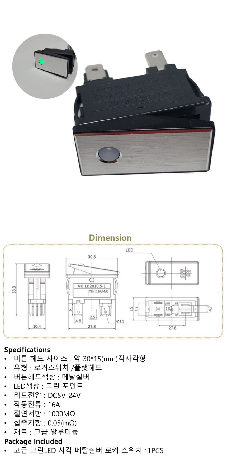 고급 사각 메탈실버 로커 스위치 그린 LED 포인트