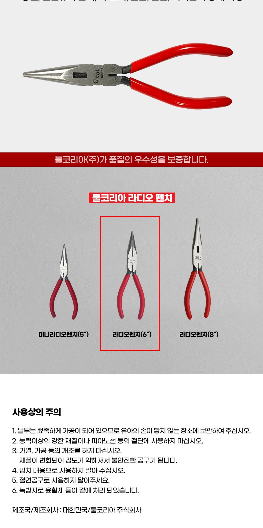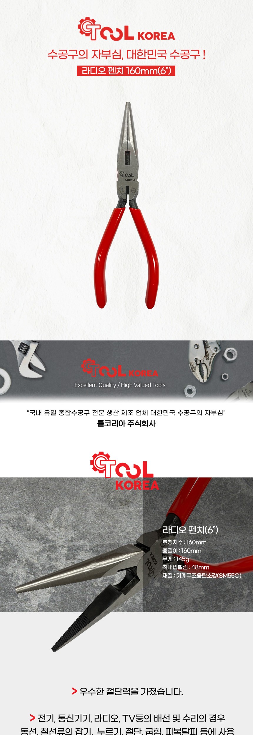 툴코리아 라디오 펜치 160mm 작업공구 니퍼 전기작업 전선작업 수공구