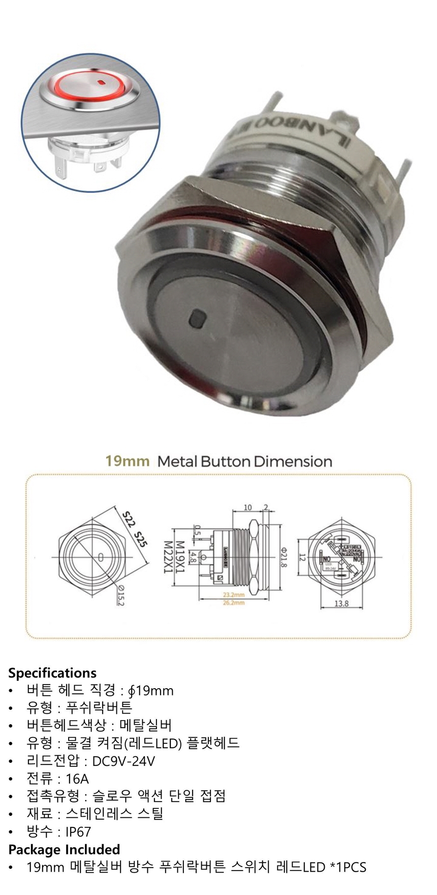 19mm 메탈실버 방수 푸쉬락버튼 스위치 레드LED 9-24V