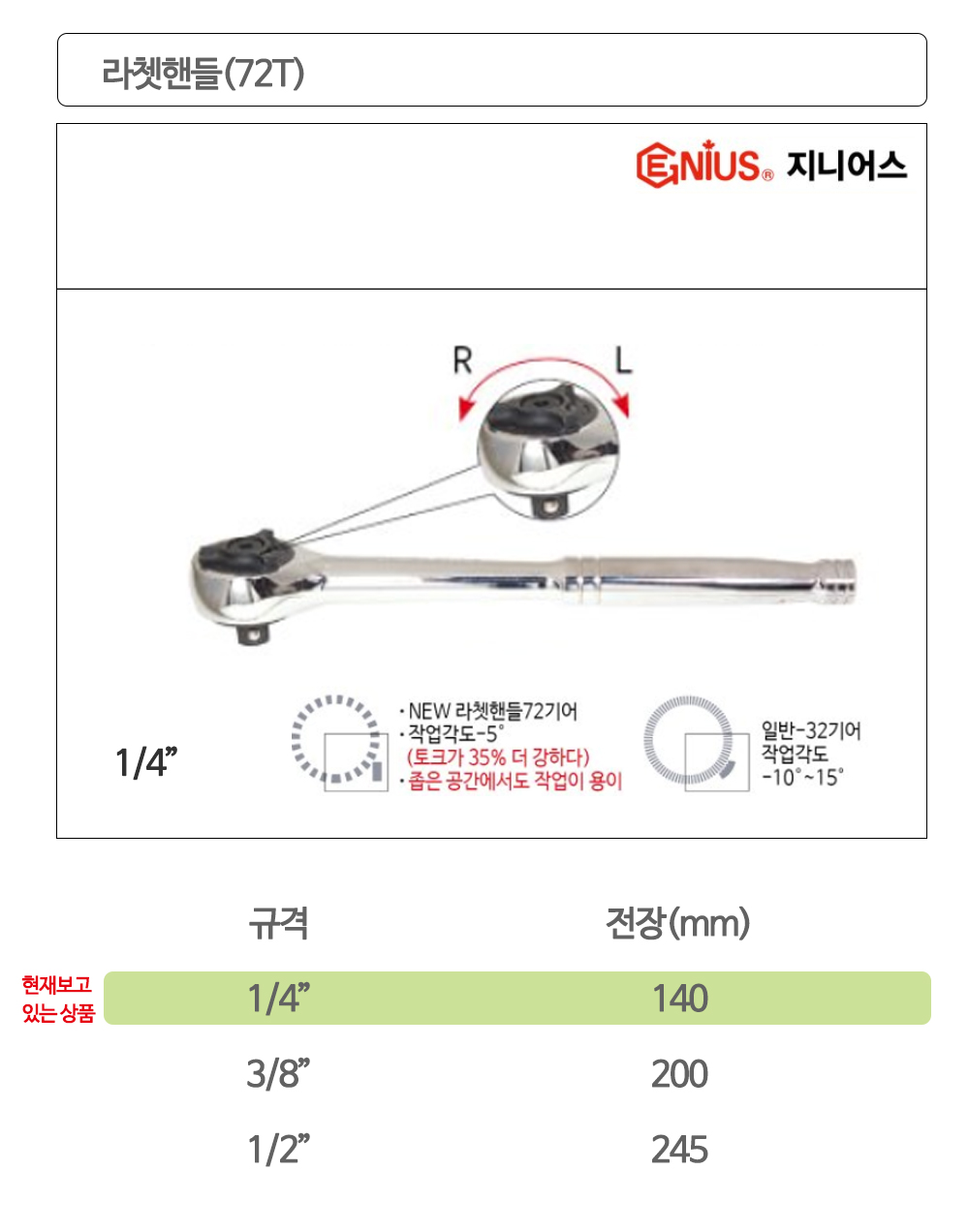 지니어스 72T 라쳇핸들 라쳇렌치 복스핸들 1/4x140mm 이미지/