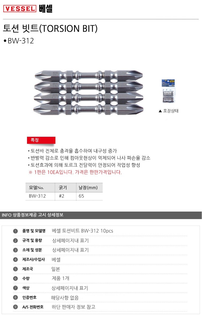 베셀 토션비트 BW-312 10pcs 공구 수공구 수작업공구 수작업 작업공구 이미지/