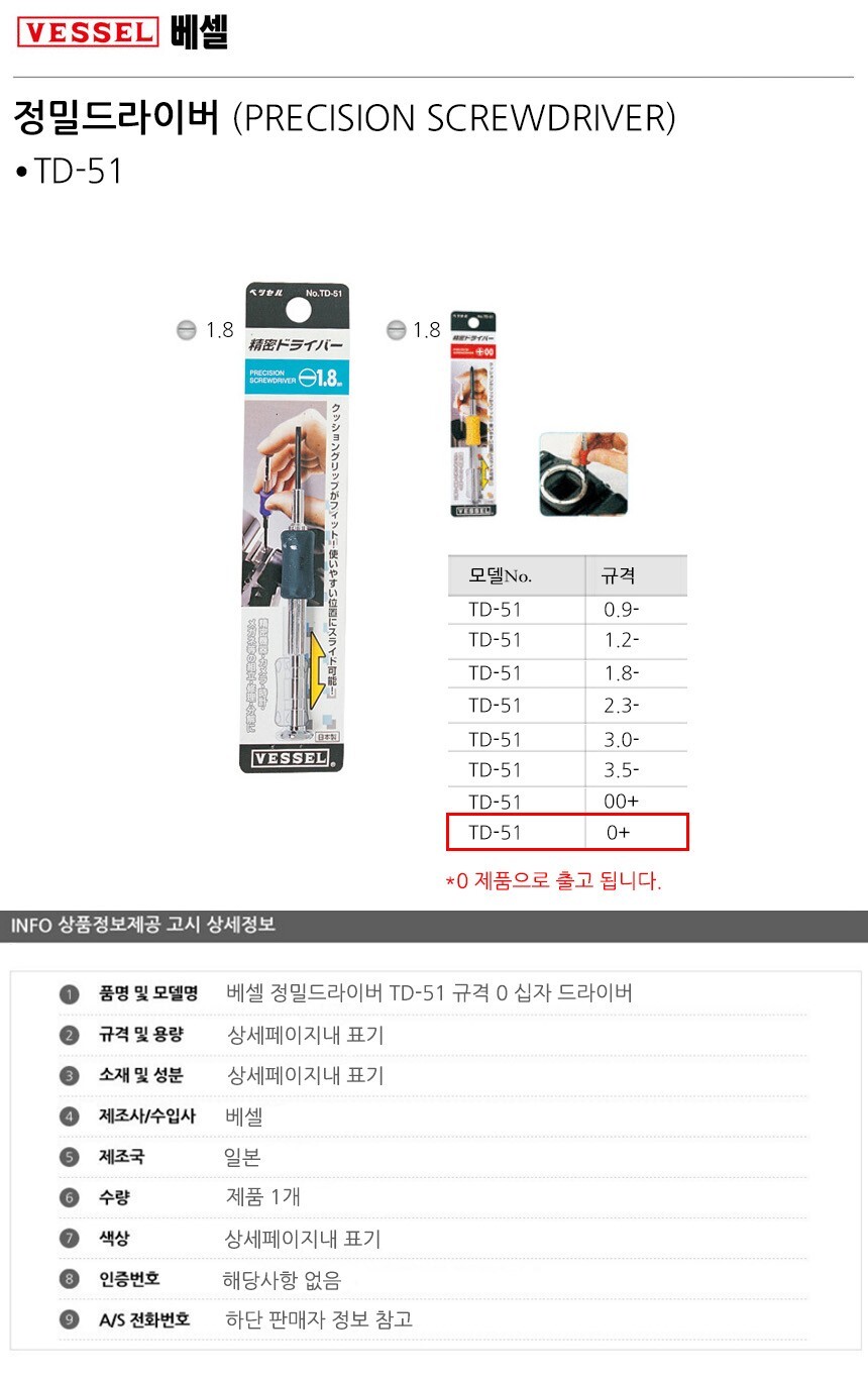 베셀 정밀드라이버 TD-51 규격 0 십자 드라이버 공구 수공구 수작업공구 수작업 작업공구