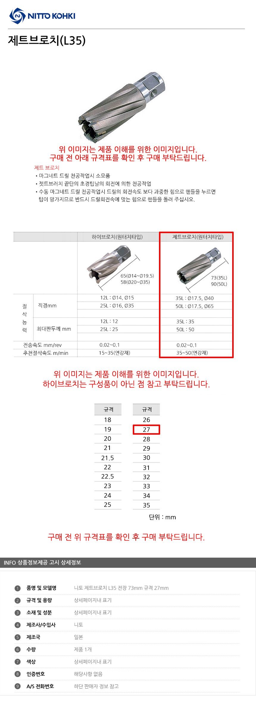 니토 제트브로치 L35 전장 73mm 규격 27mm 공구액세서리 보링비트 마그드릴 브로치캇 이미지/