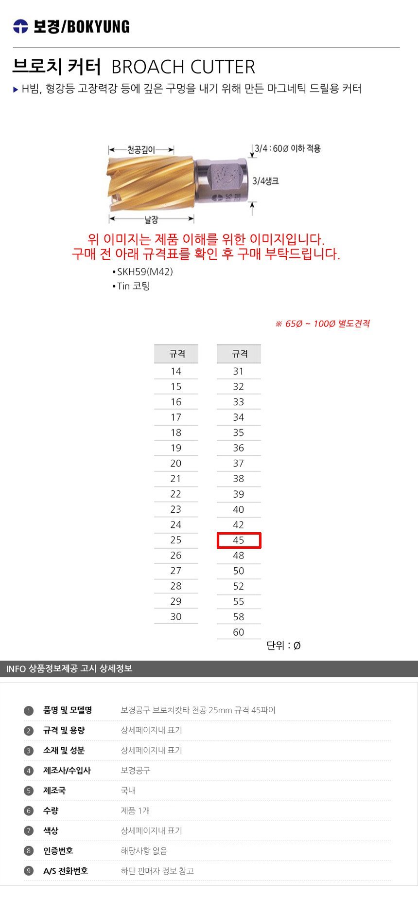 보경공구 브로치캇타 천공 25mm 규격 45파이 공구액세서리 보링비트 마그드릴 브로치캇타  이미지/