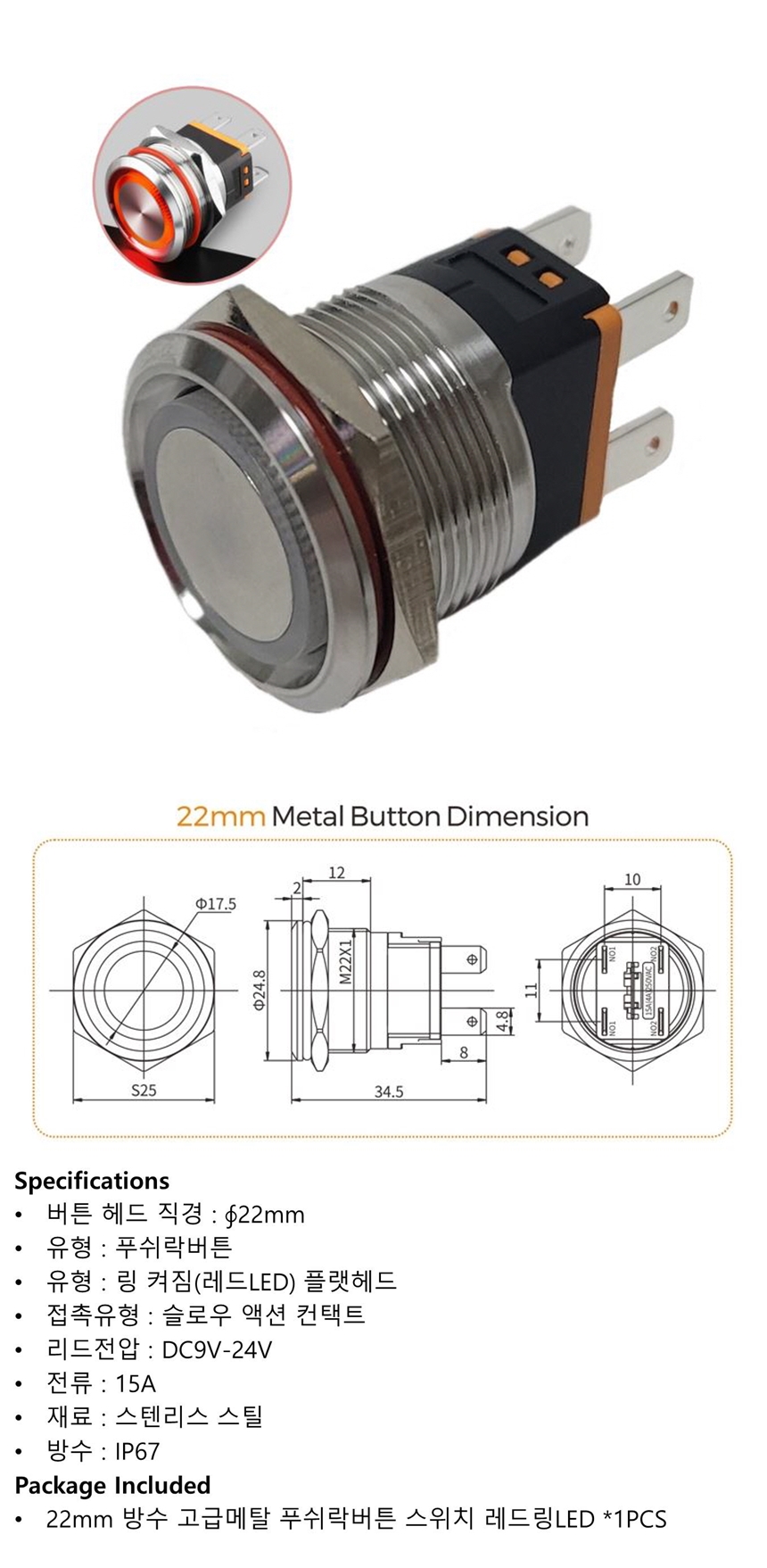 12V 22mm 방수-푸쉬락버튼 스위치 레드링LED 고급메탈