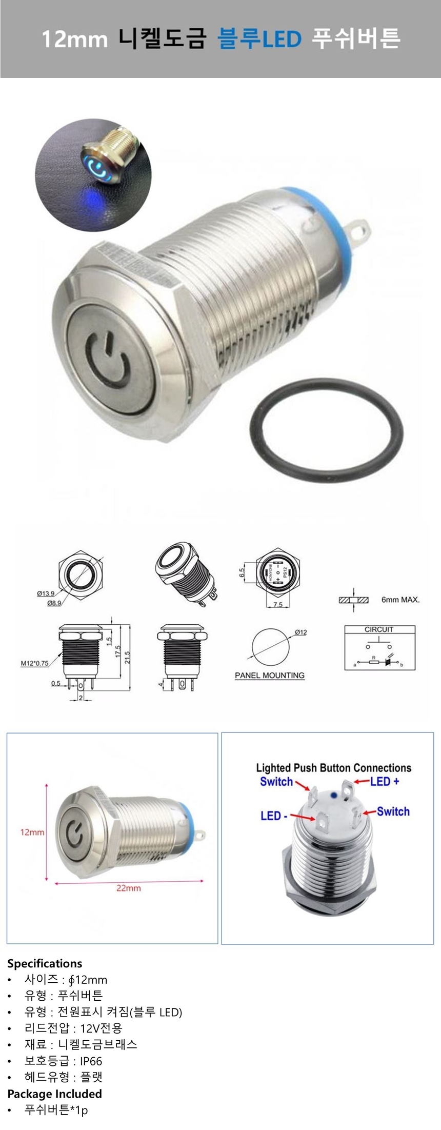 12V 12mm 방수 푸쉬 버튼 스위치 블루 LED전원 니켈 도금