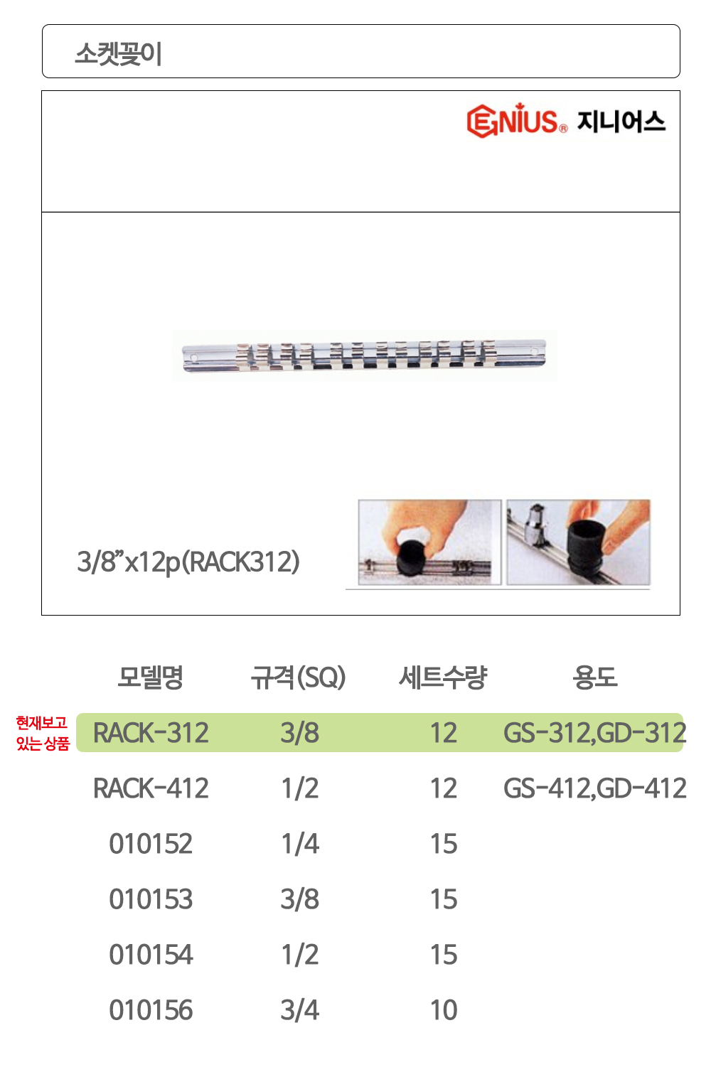 지니어스 소켓꽂이 RACK-312 3/8x12P 이미지/
