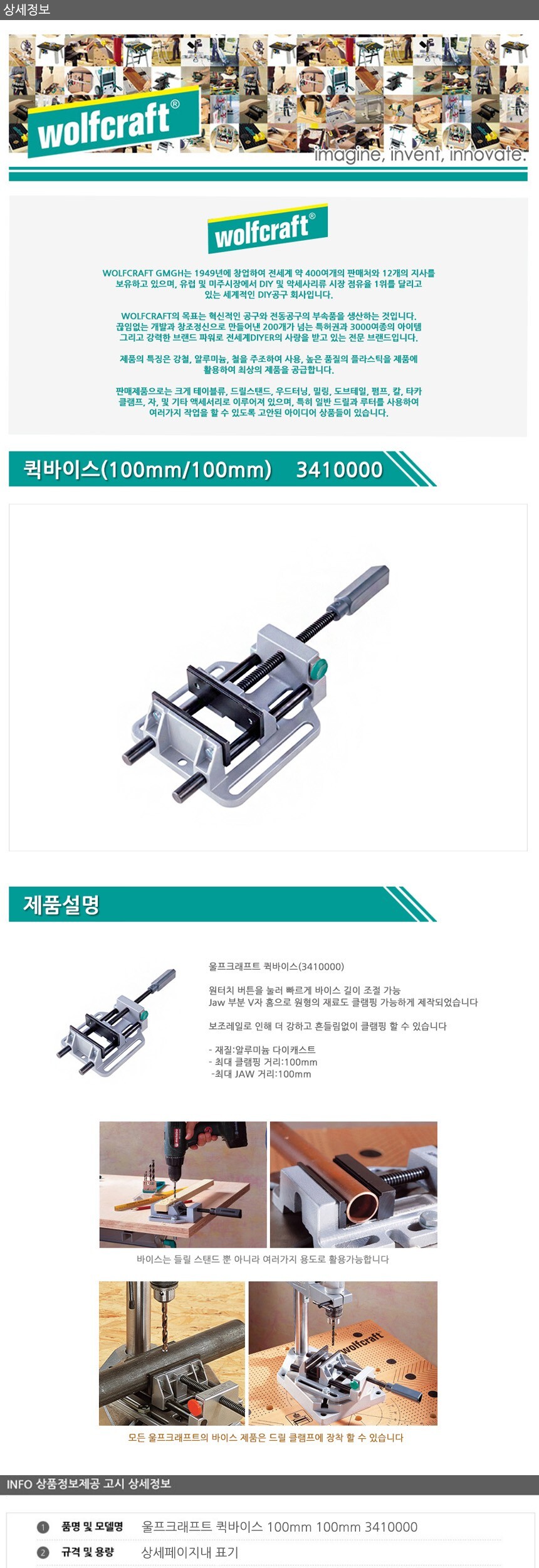 울프크래프트 퀵바이스 100mm 100mm 3410000 공구 수공구 수작업공구 수작업 작