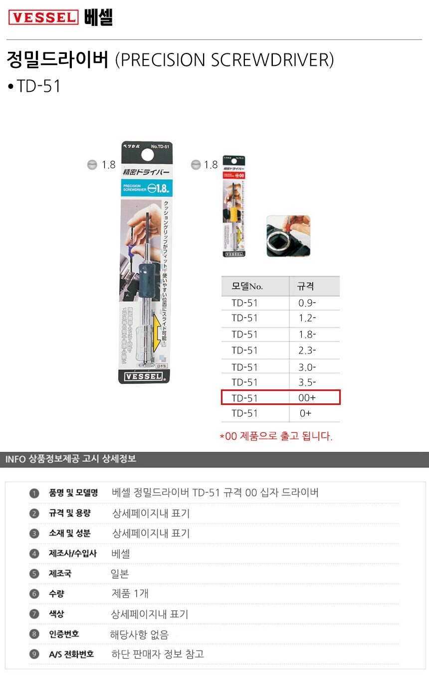 베셀 정밀드라이버 TD-51 규격 00 십자 드라이버 공구 수공구 수작업공구 수작업 작업공