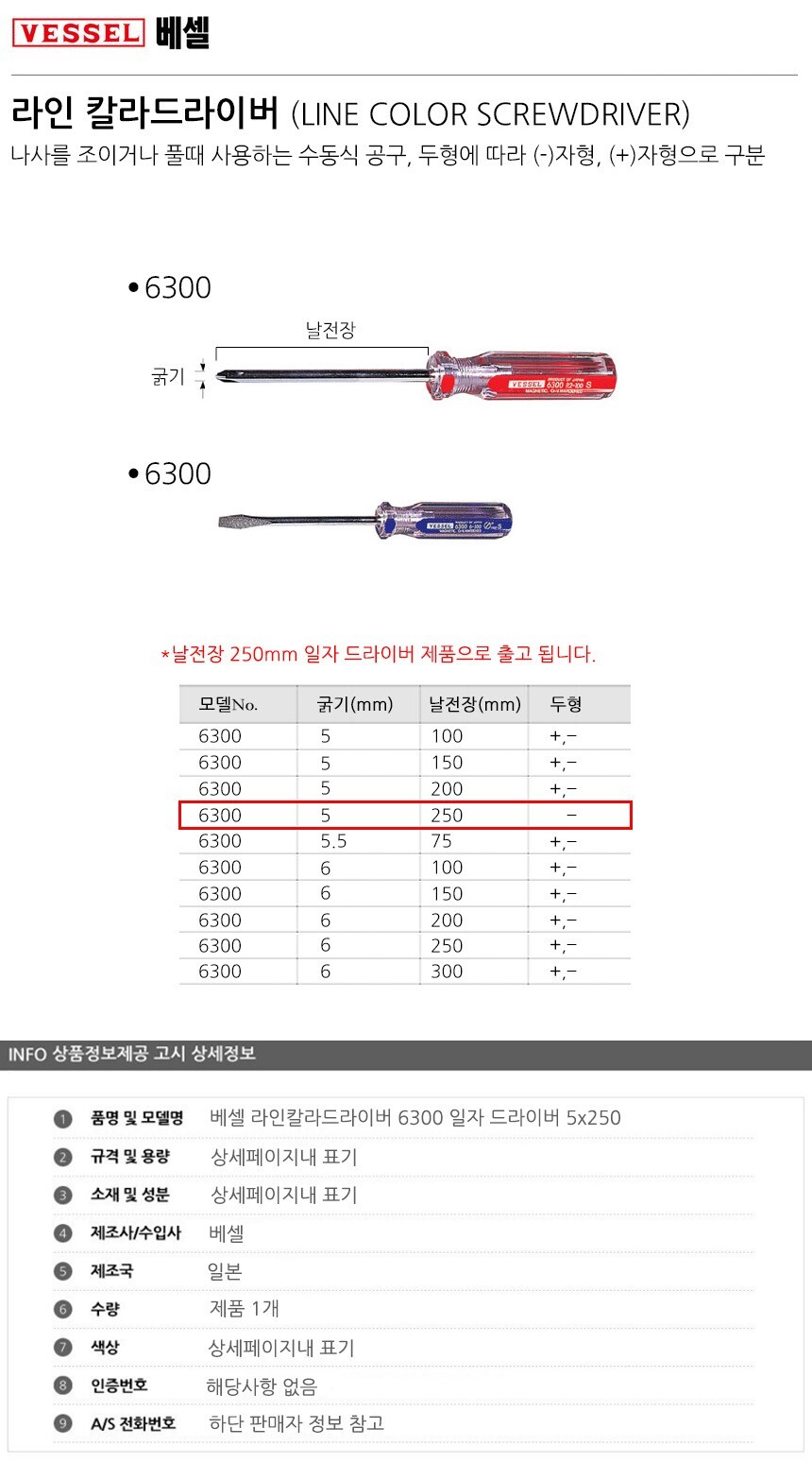 베셀 라인칼라드라이버 6300 일자 드라이버 5x250 공구 수공구 수작업공구 수작업 작업