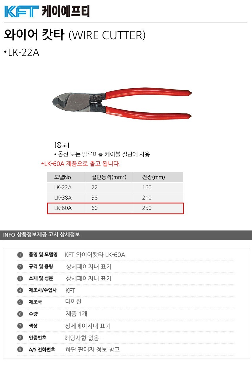 와이어캇타 LK-60A 케이블커터 절삭공구 케이블캇타 수작업 작업공구 이미지/