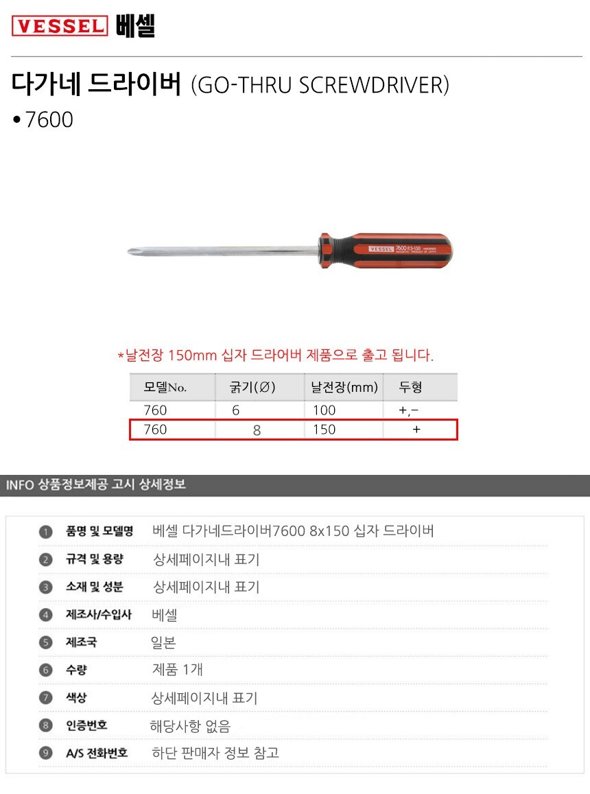 베셀 다가네드라이버7600 8x150 십자 드라이버 공구 수공구 수작업공구 수작업 작업공구