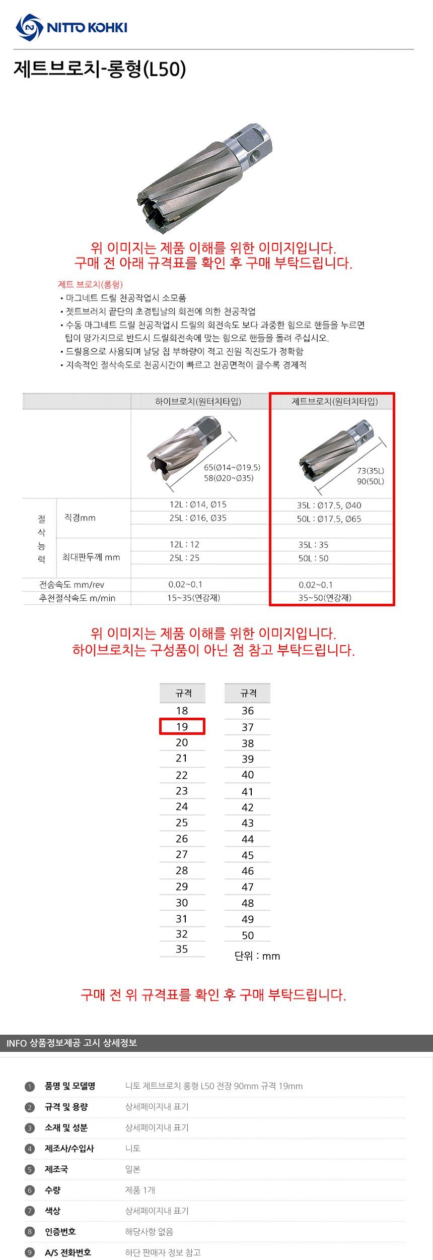 니토 제트브로치 롱형 L50 전장 90mm 규격 19mm 공구액세서리 보링비트 마그드릴 브