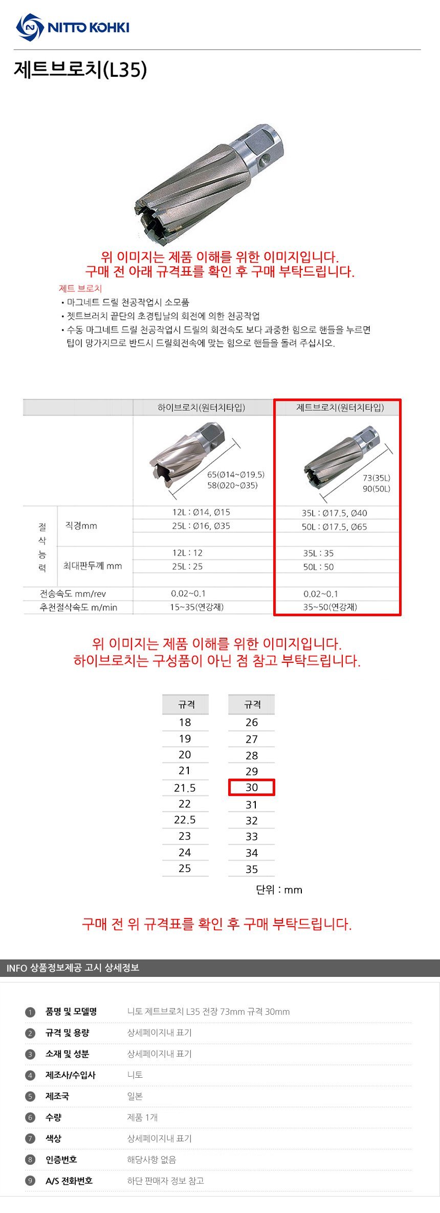 니토 제트브로치 L35 전장 73mm 규격 30mm 공구액세서리 보링비트 마그드릴 브로치캇 이미지/