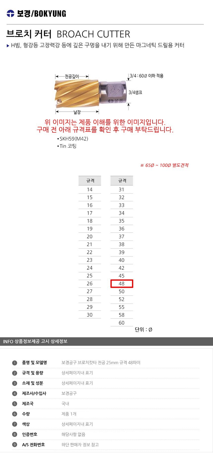 보경공구 브로치캇타 천공 25mm 규격 48파이 공구액세서리 보링비트 마그드릴 브로치캇타  이미지/