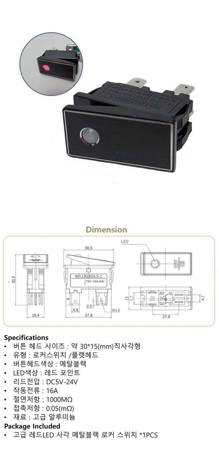 고급 사각 메탈블랙 로커 스위치 레드 LED 포인트