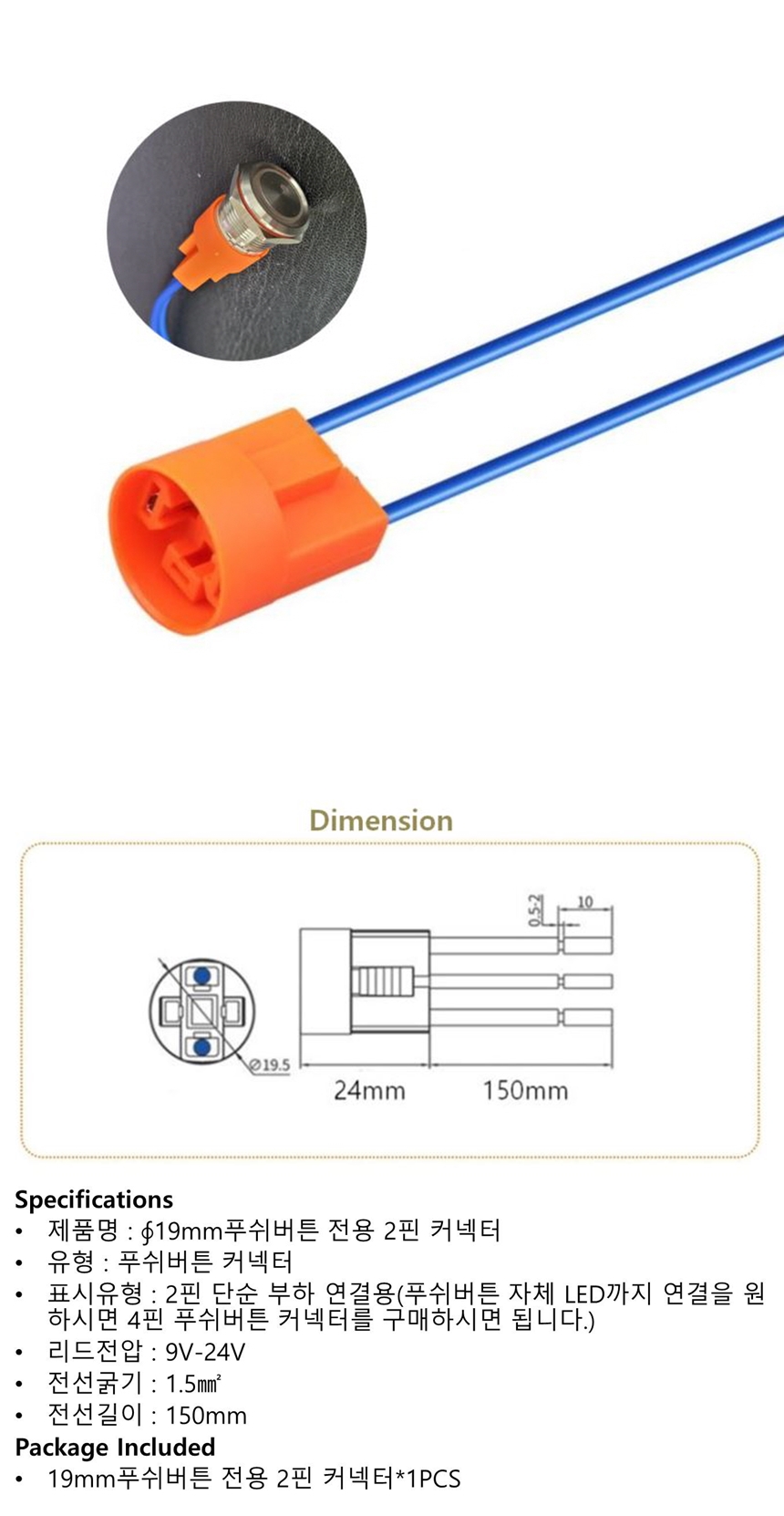 19mm 푸쉬버튼 전용 2핀 커넥터 접속 플러그인 이미지/